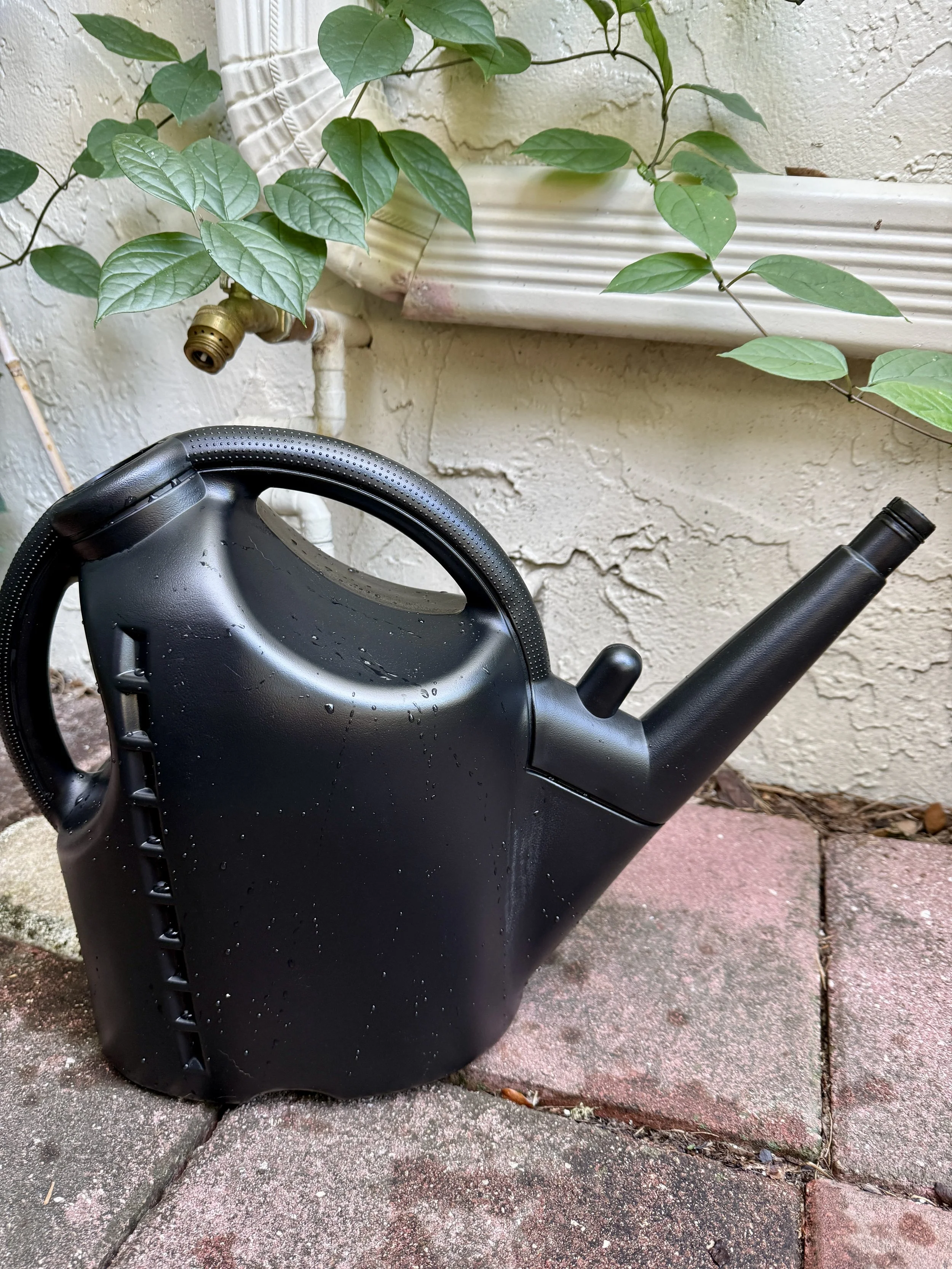 This is a nice big watering can. Most you find in the store are 1.5-2 gallons. The long narrow spout makes for easy targeted watering. And the narrow build of the can itself makes for easy storage when not in use.